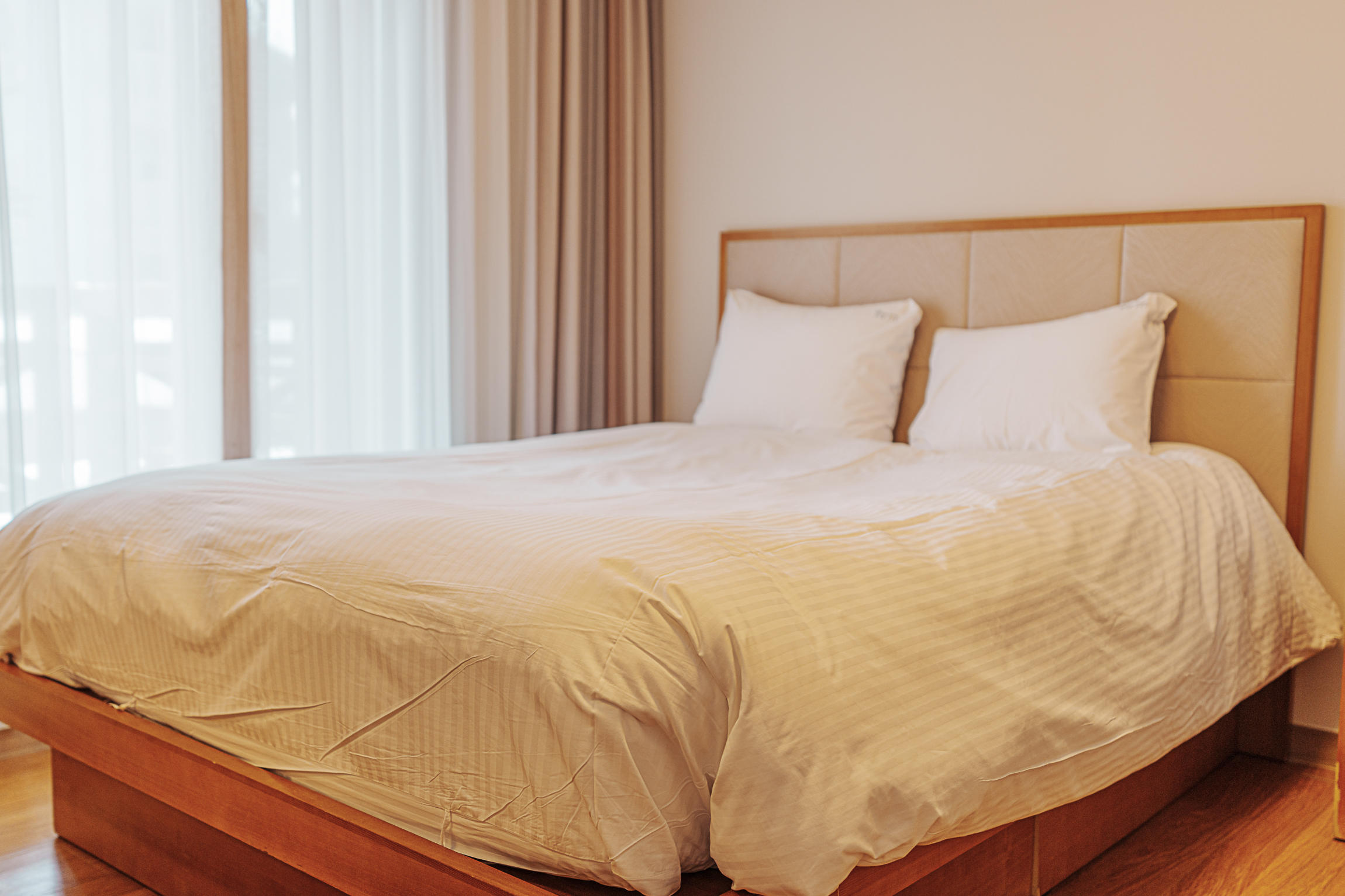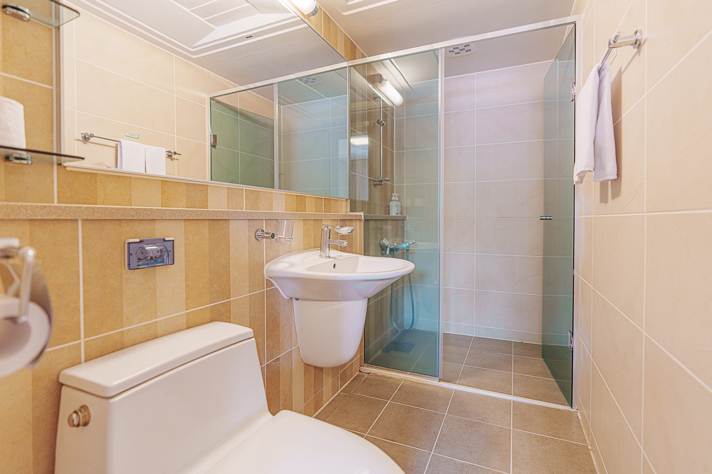 양실에는 퀸 사이즈 침대와 함께 욕실이 마련되어 있습니다. 욕실에는 기본적인 비품인 수건, 샴푸, 바디클렌저, 비누, 휴지가 비치되어 있으며, 칫솔과 치약, 세안제 등 개인위생 용품은 별도로 준비해야 합니다. 거실 쪽에도 욕실이 하나 더 있어 편리하게 이용할 수 있습니다.