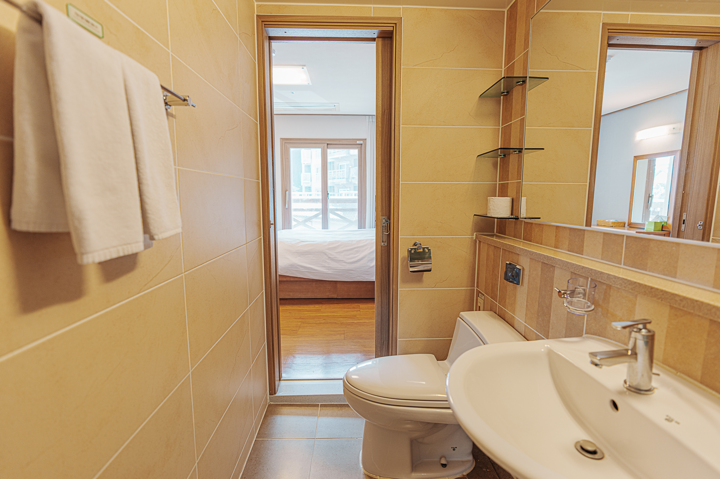 온돌방은 전통적인 한실로 구성되어 있으며, 화장대와 침구류가 구비되어 있습니다. 온돌방과 연결된 욕실은 접근성이 좋아 한실을 이용하는 투숙객도 편리하게 사용할 수 있습니다.